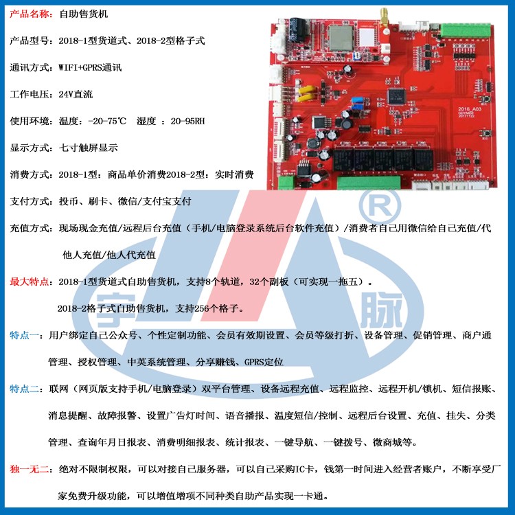 宇脉单片机主板厂家,成立于03年,至今已经十四年,十几年的技术沉淀,主板稳定灵敏,支持定制开发,享受厂家免费升级功能,终身维护。宇脉自助售货机主控板,主控技术自主研发生产销售,多功能自助设备 。欢迎来电咨询:18520500709/400-1898-020