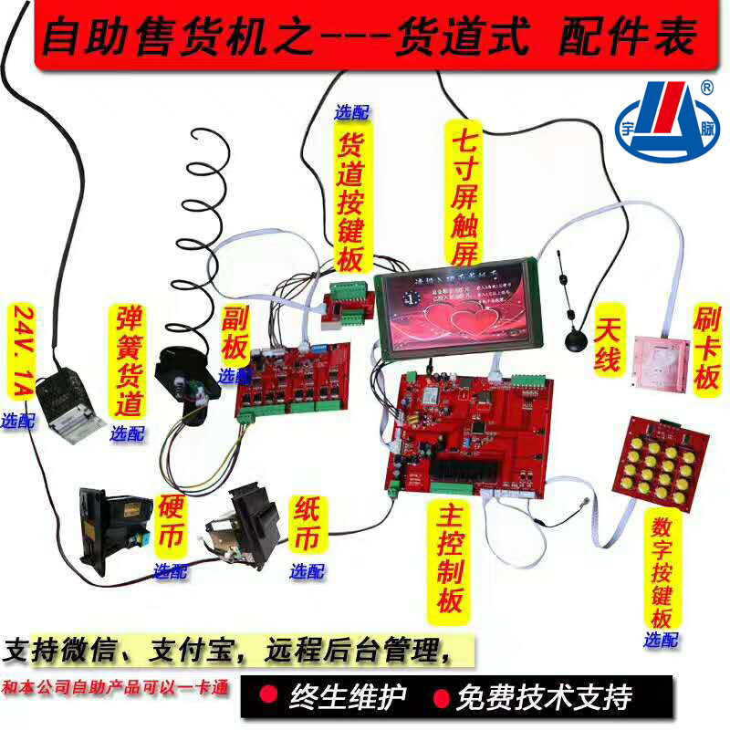 最大特点:货道式自助售货机,支持8个轨道,32个副板(一个主板支持5个副板)。联网管理(网页版支持手机/电脑登录)设备远程控制、短信报账、故障报警、语音播报、远程后台设置、充值、挂失、分类管理、查询年月日报表、一键导航、商城等。